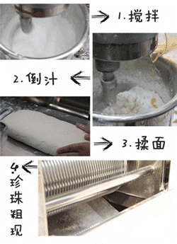 搅拌、倒汁、揉面、成型,每一颗手作珍珠都需要经过这四个步骤,经过机器的高速运转,木薯粉从白色的粉状抱作成团,一颗颗跳动的手作珍珠欢欣鼓舞的跳进容器,又一颗颗色彩鲜明的跳出来。